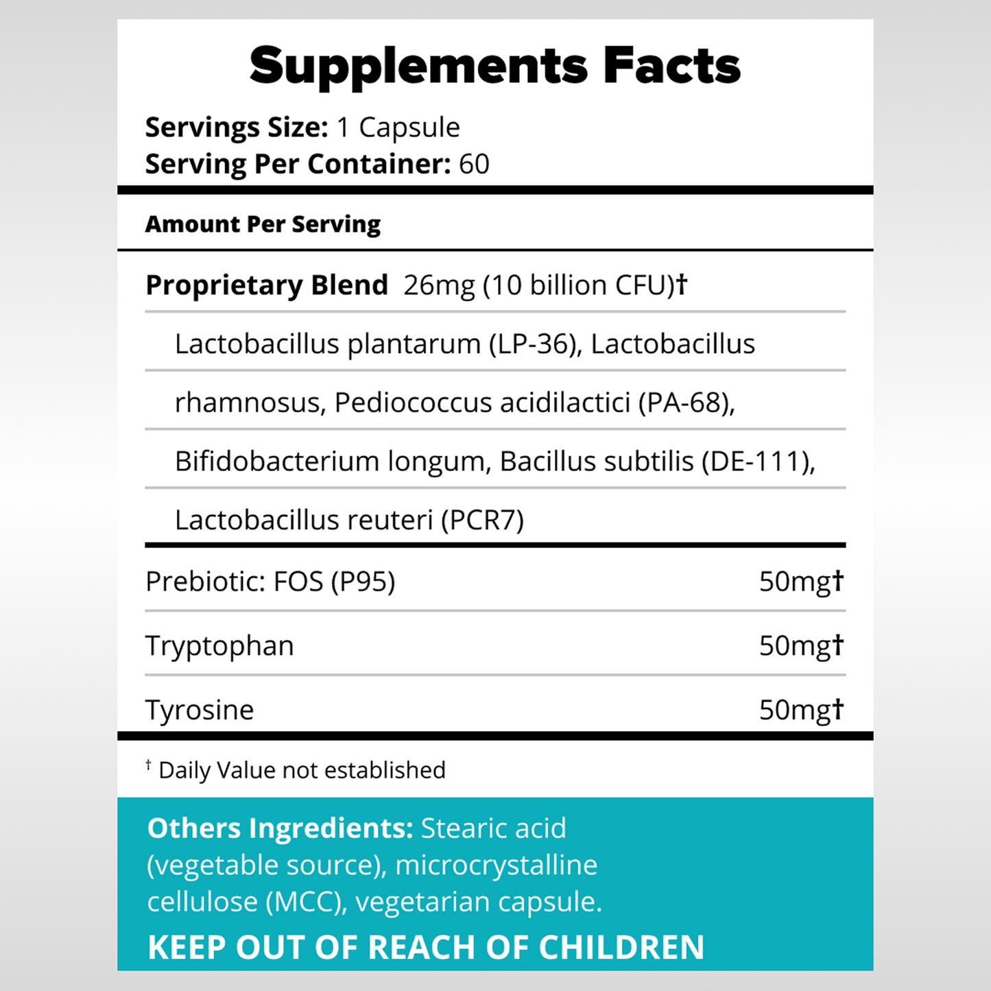 This multi-strain formulation not only encourages the gut to produce natural mood-balancing compounds like serotonin and GABA, but also: