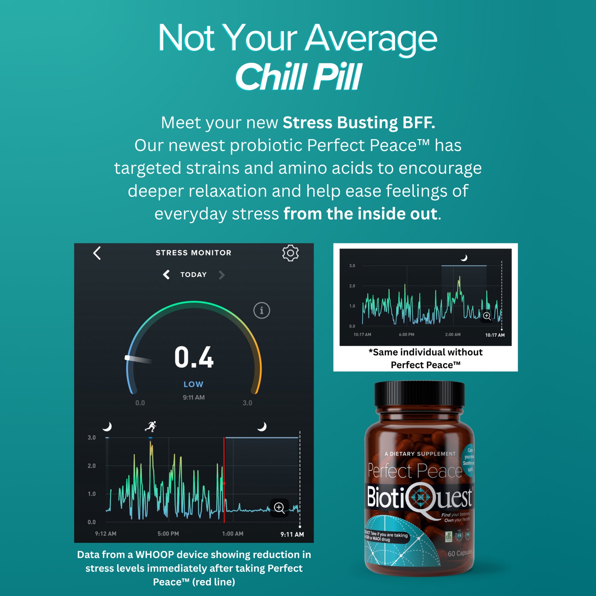 What sets Perfect Peace™ apart is its targeted, science-backed blend of probiotic strains — a uniquely designed guild created to restore the gut’s role as a foundation for calm and resilience. It’s more than a probiotic; it’s a gentle, natural ally for navigating life’s stresses with greater ease.