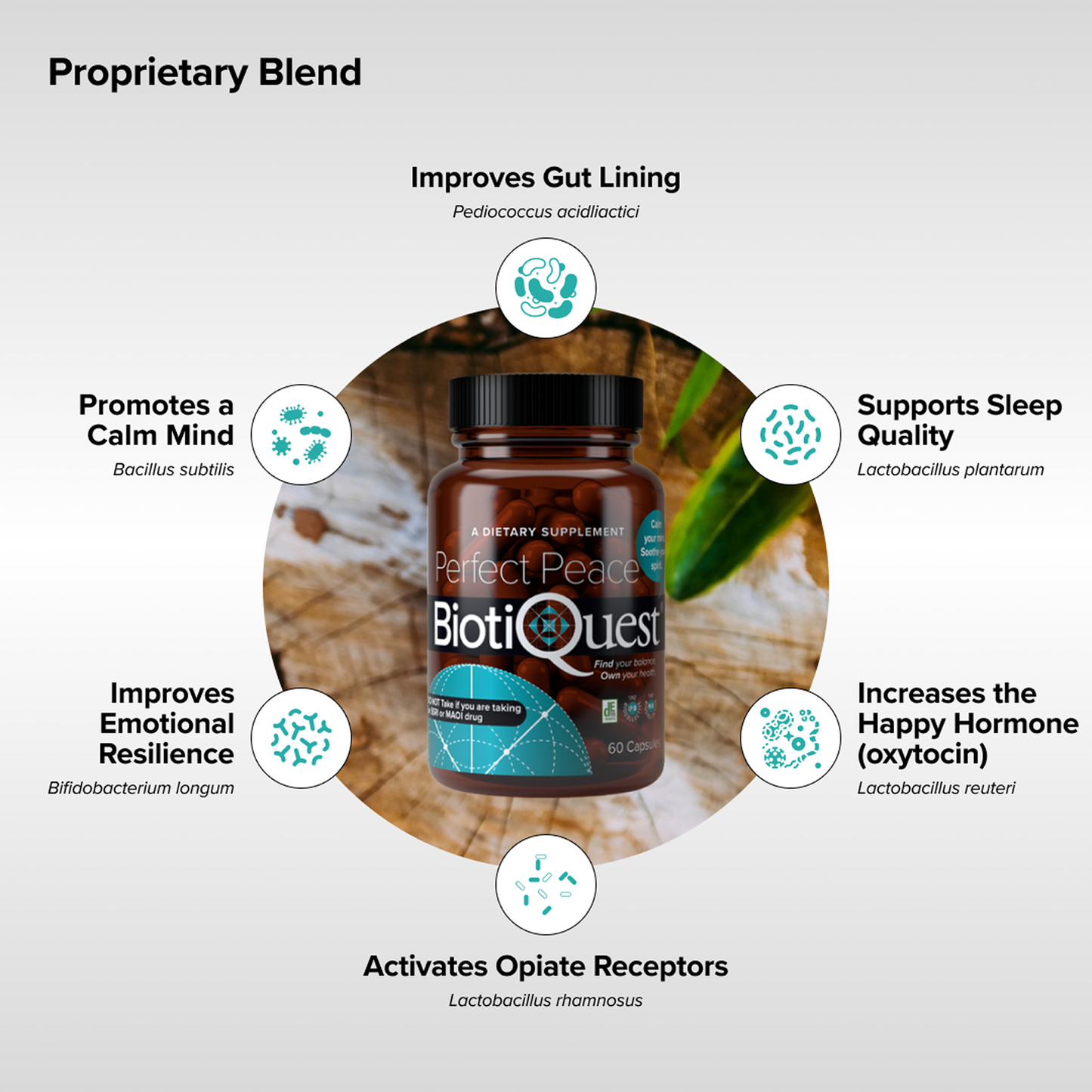 The Perfect Peace™ guild of carefully selected probiotic strains works in harmony to help your gut produce calming neurotransmitters — like serotonin and GABA — which naturally soothe the nervous system and support emotional balance. By nurturing this gut-brain dialogue, Perfect Peace™ helps ease the physical and mental tension that everyday stress can create.