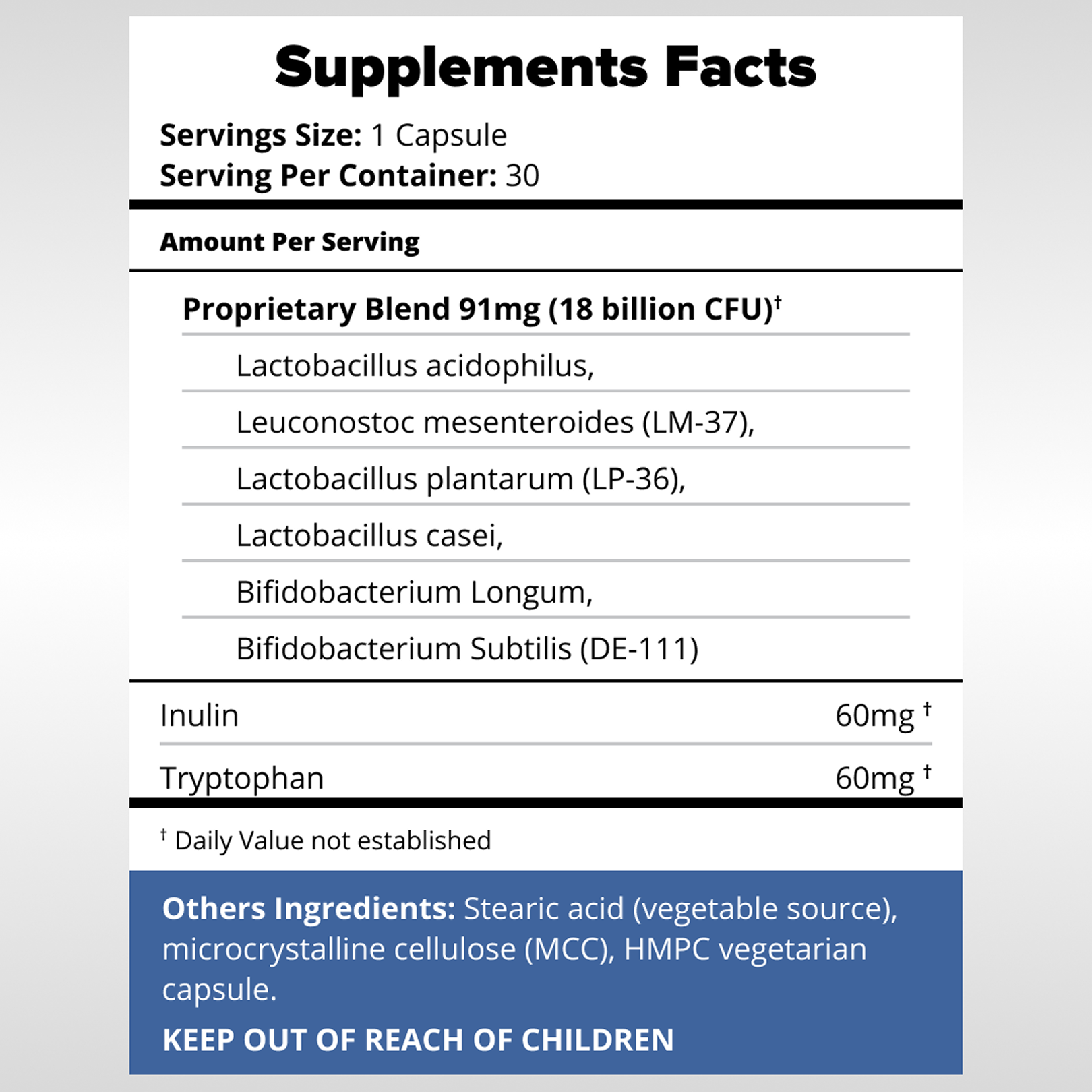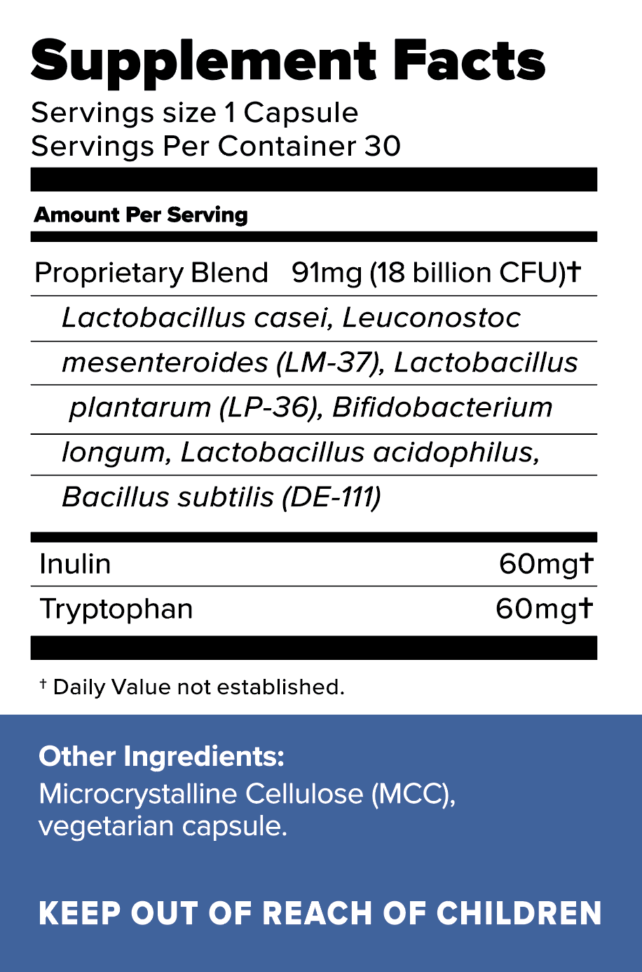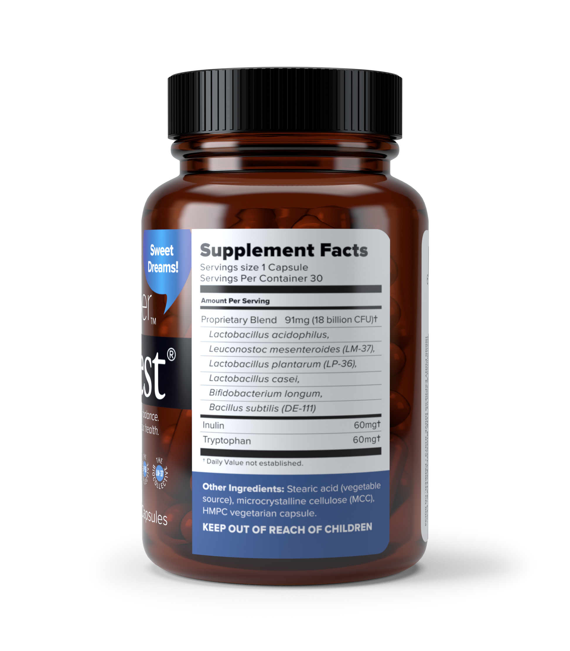 When the gut lining is compromised, bacterial by-products (metabolites and bacterial toxins) can cross the barrier and cause inflammation that directly affects how you sleep. You’ll find two proprietary strains in our six-strain formula carefully chosen to work in harmony with the other strains. This formula was designed to help the body produce metabolites that promote sleep and relaxation, prevent inflammatory compounds from crossing the barrier and decrease the pathogen load. Together, these six bacteria form a stable, sustainable bacterial community and help support a healthy gut microbiome and more importantly, support sound sleep.