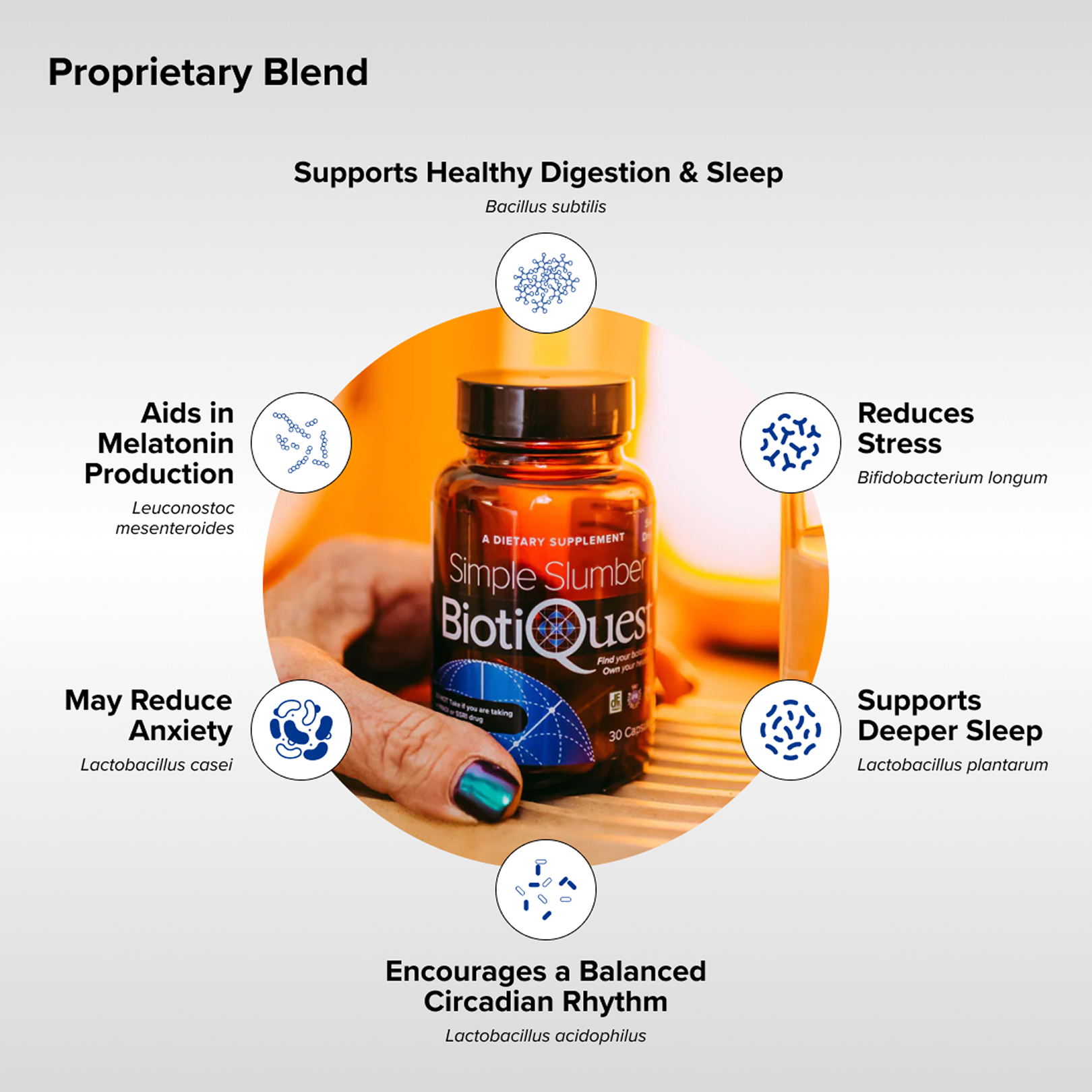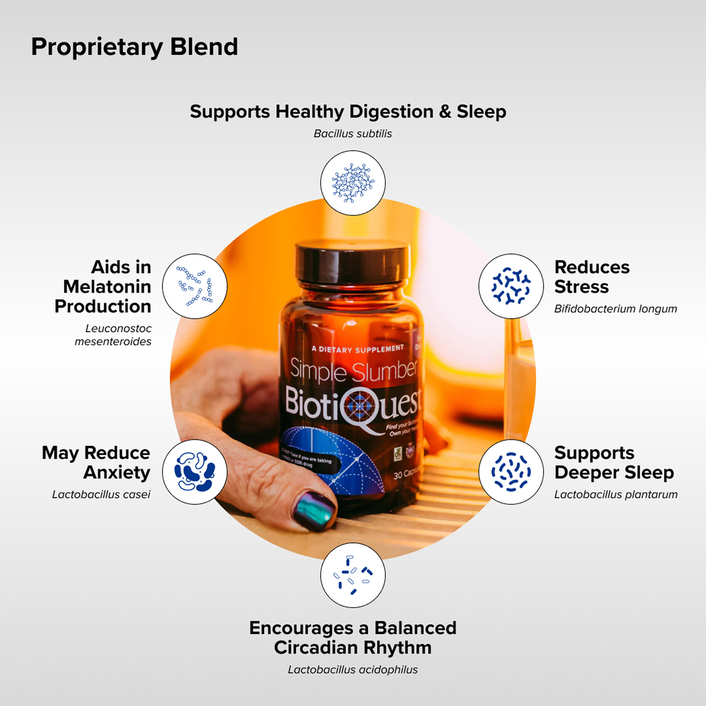 The gut microbiome is key in the connection between our digestive system and our brain. The signaling that occurs between these two systems is mediated by metabolites and other compounds produced by the gut microbiome. This signaling may result in a more relaxed and controlled sleep cycle. Simple Slumber™ helps support balanced signaling between the gut and the brain and promotes peaceful, sound sleep.