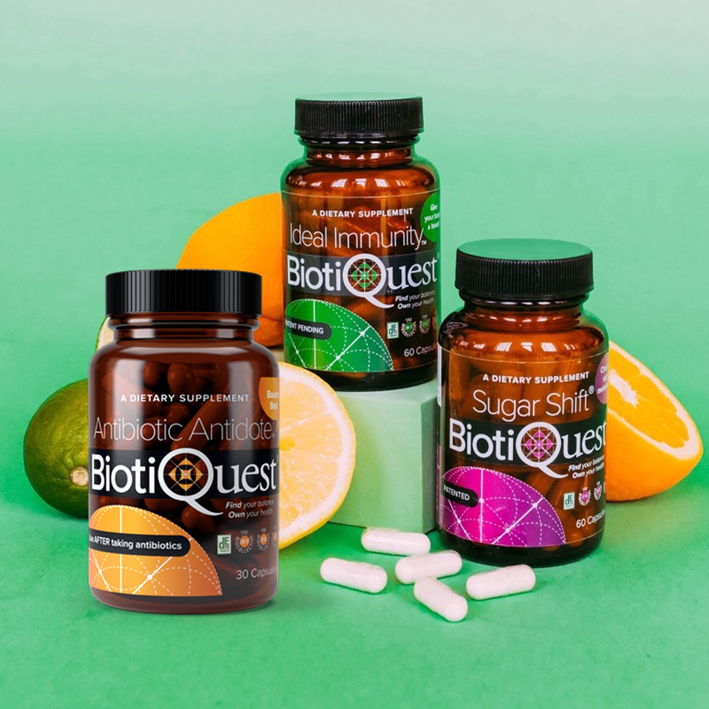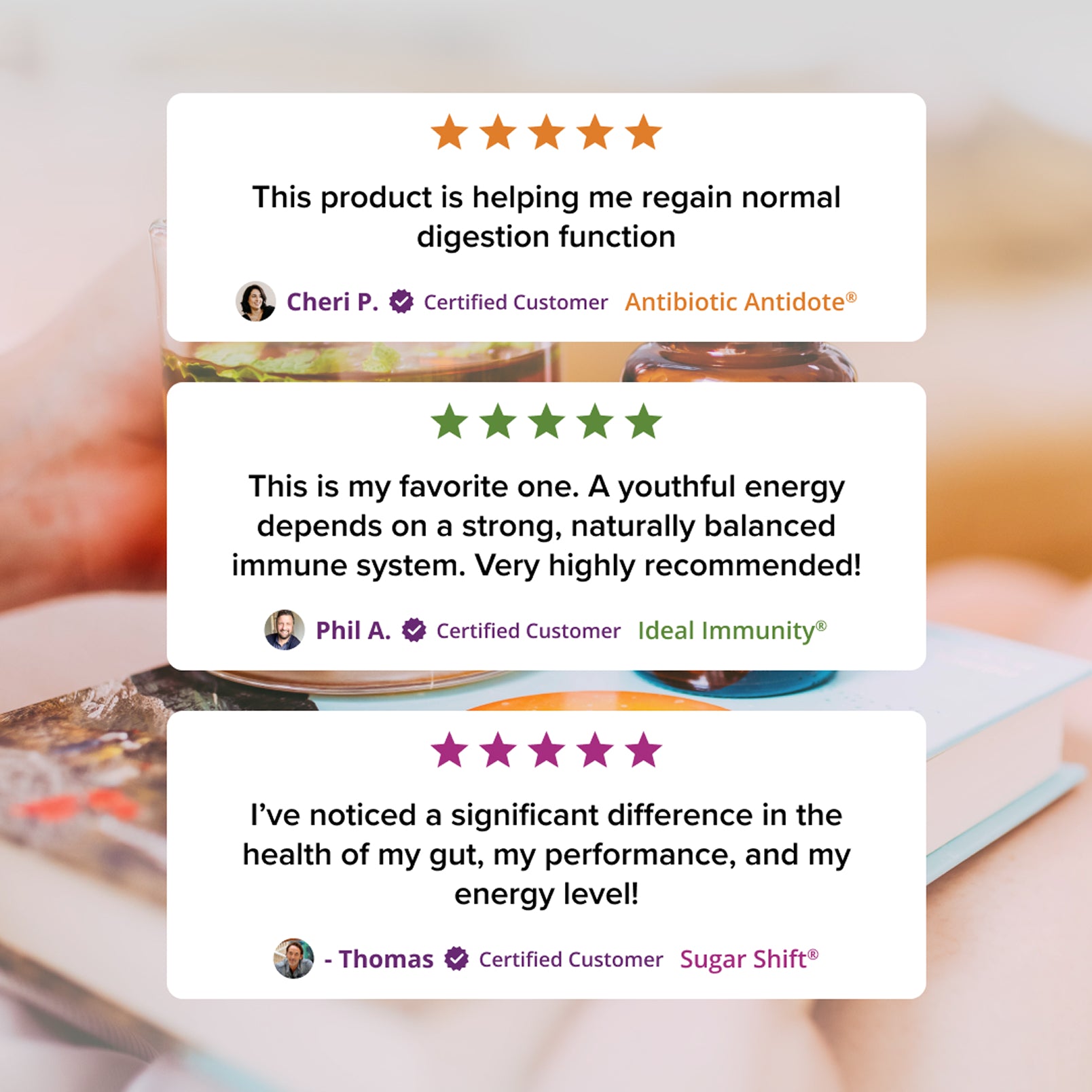 Think of it like a slow drip. Even without a recent antibiotic prescription, your microbiome may be under daily stress from environmental exposures. That’s why the Starter Pack begins with Antibiotic Antidote—to help gently clear the terrain and prepare your gut ecosystem. Ideal Immunity then supports immune resilience, and Sugar Shift works to rebalance your long-term microbial health, promoting a more stable and vibrant inner environment.