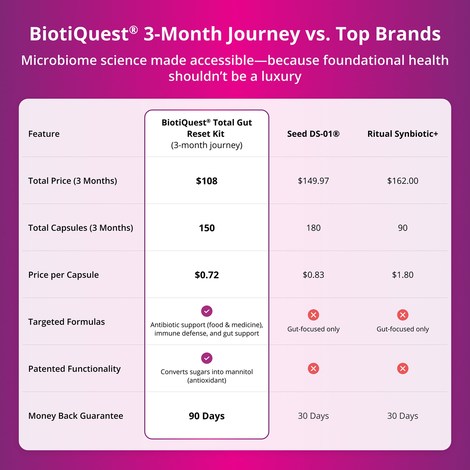Most probiotics are general blends with uncertain outcomes. BiotiQuest® is different—we use purpose-driven “guilds” of bacteria, carefully selected to work together and target specific gut challenges. Our formulas are backed by over nine years of microbiome research, full genomic sequencing, and a proprietary BioFlux® model that ensures predictable, real-world results. It’s not guesswork—it’s precision probiotics built for people who want real change, not just capsules.